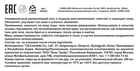 Увлажняющий успокаивающий гель с огурцом, 300мл, LEBELAGE